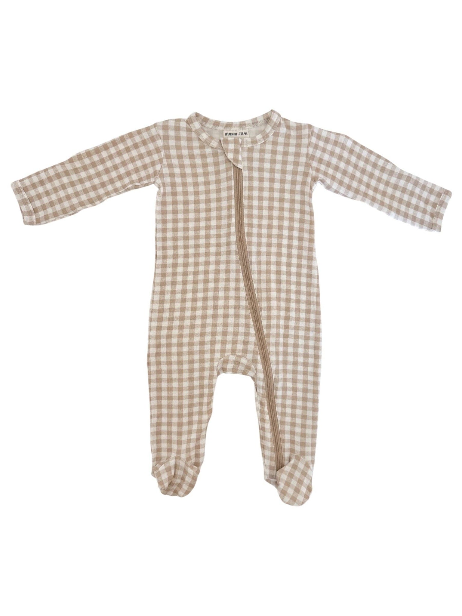 Soft, classic, and endlessly versatile - our Tan Gingham Collection is a timeless staple for every little one. Featuring a neutral tan gingham print, this collection brings a gentle, gender-neutral charm that’s perfect year-round. Made from 95% viscose from bamboo with just the right amount of stretch, these pieces are lightweight, breathable, and buttery soft for all-day adventures, naps, and snuggles. The perfect blend of comfort and style for your baby’s everyday lineup