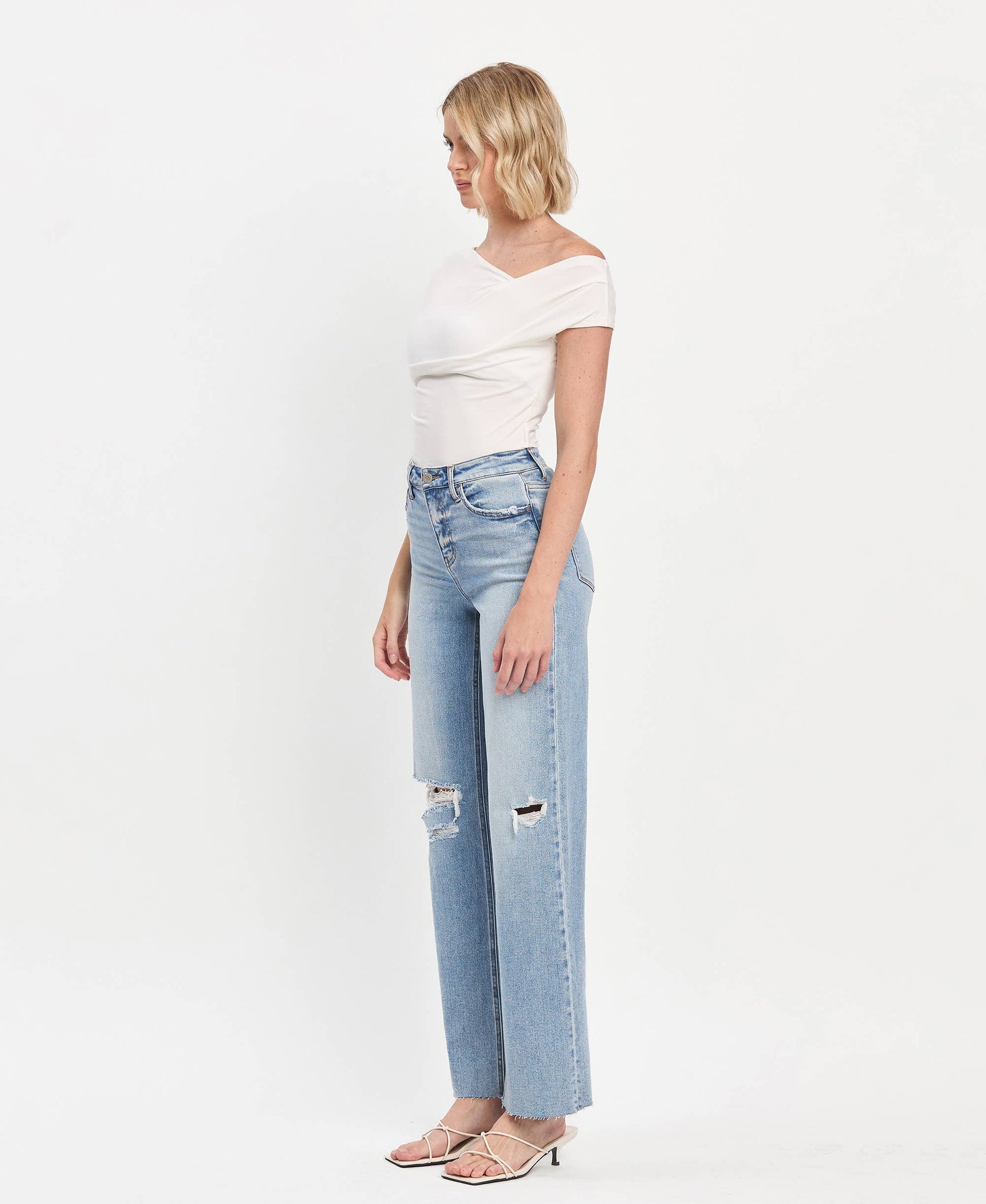 COMFORT STRETCH DENIM, HIGH RISE WAIST, DISTRESSED DETAIL, CLEAN CUT RAW HEM, FULL LENGTH, WIDE LEG JEANS F. RISE: 10 1/2" / INSEAM: 32"