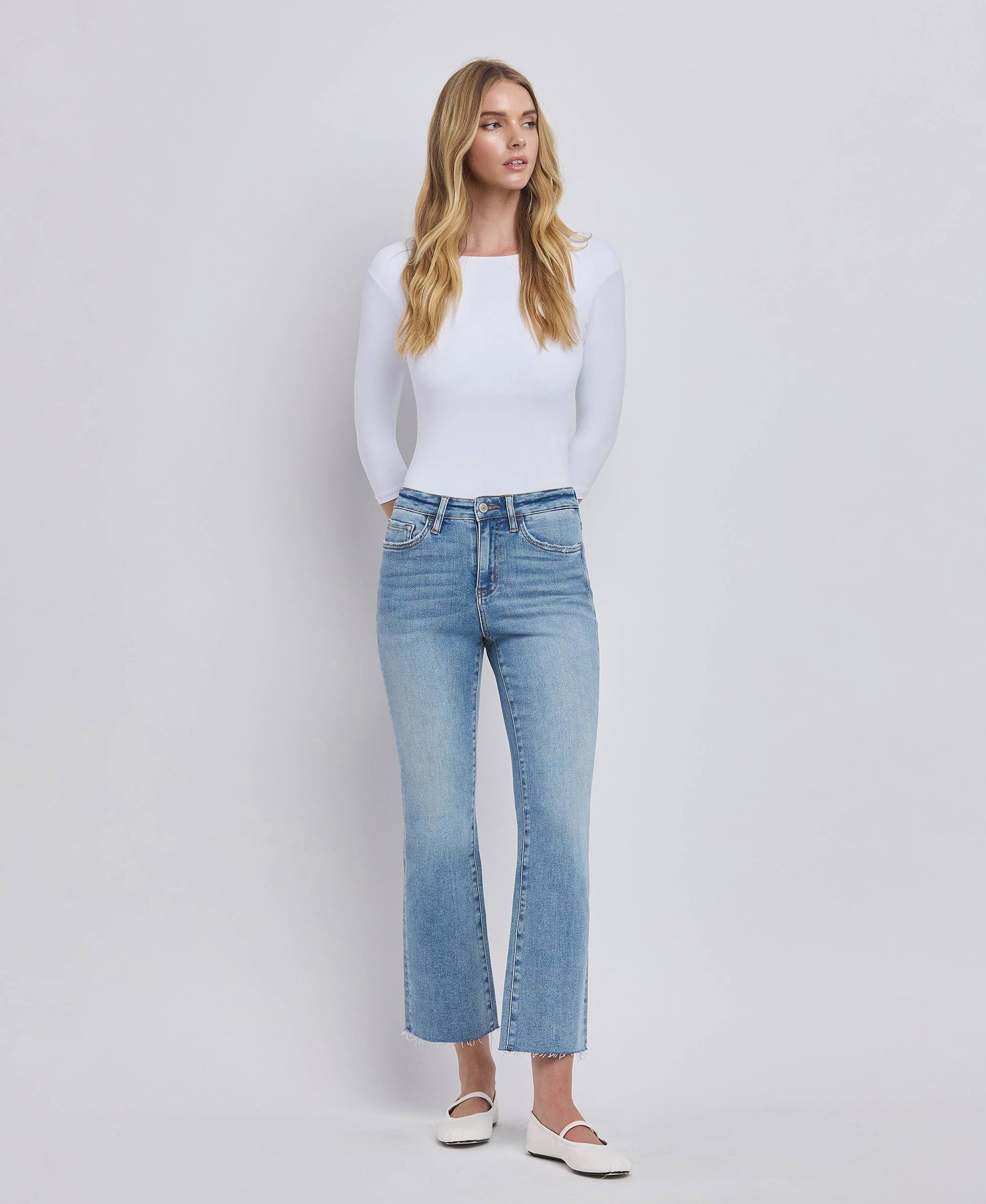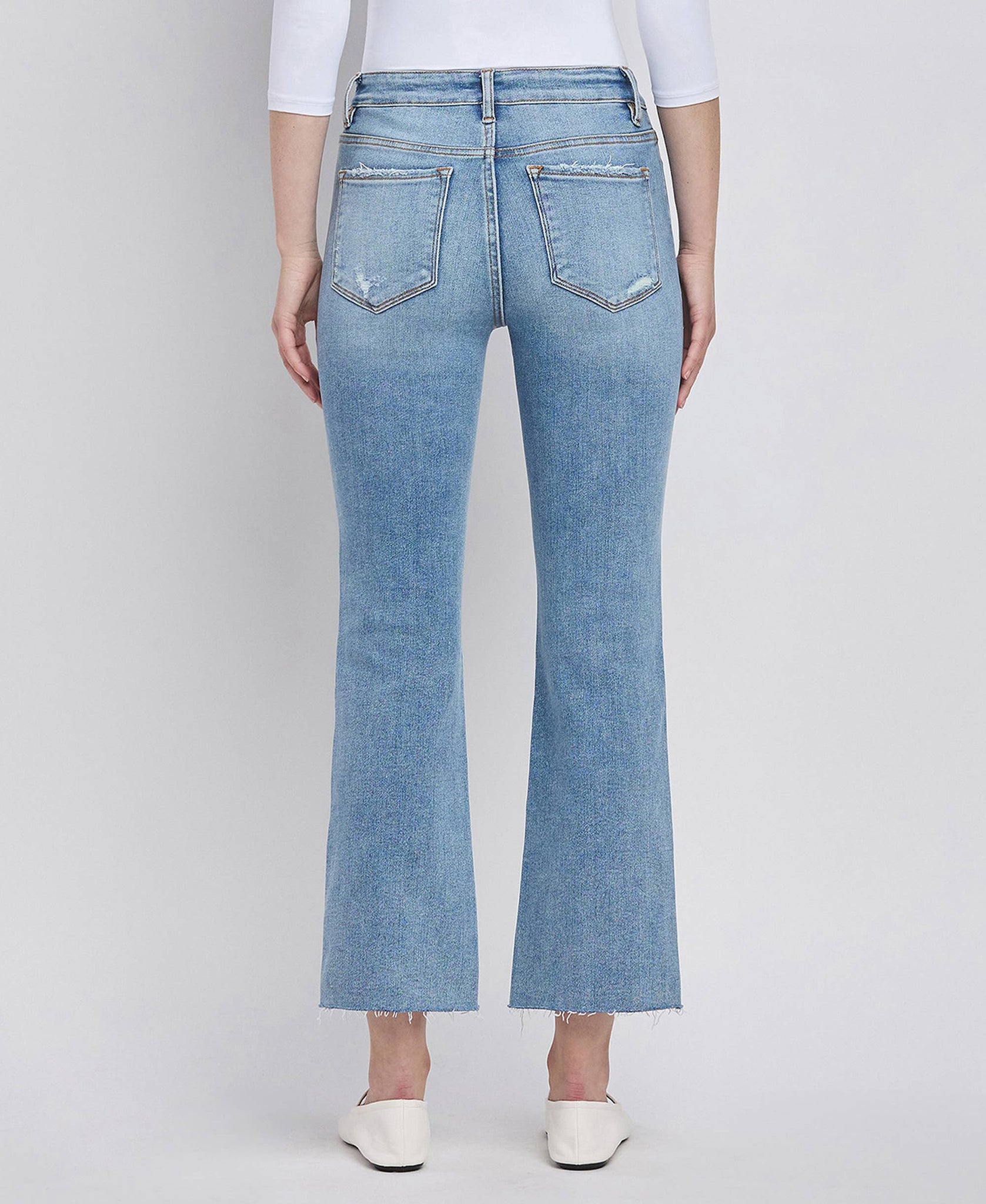 COMFORT STRETCH DENIM, HIGH RISE WAIST, SLIGHTLY DISTRESSED DETAIL, CLEAN CUT RAW HEM, CROPPED LENGTH, FLARE JEANS