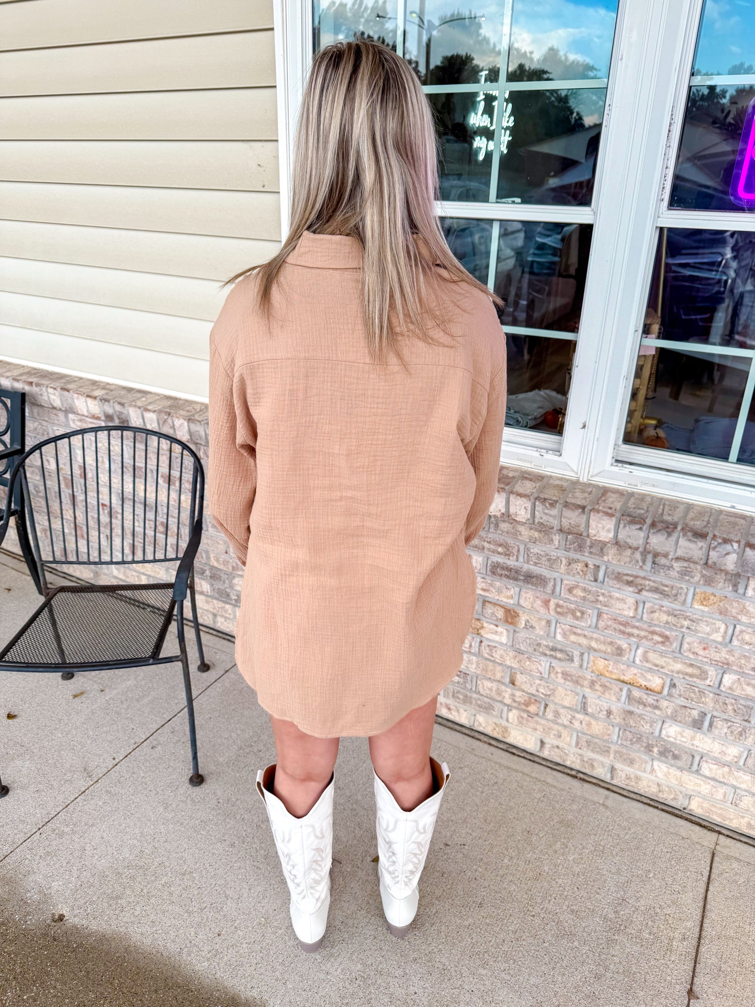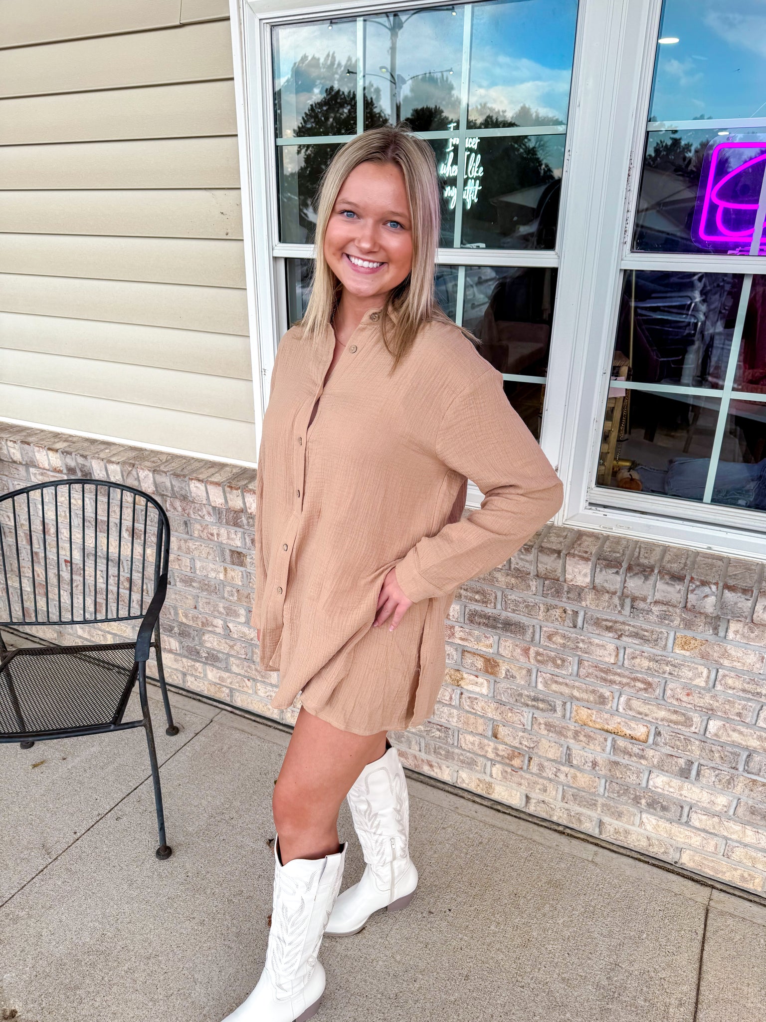 A solid, crinkle cotton romper with the following features: Collar neckline. Button front closure. Long sleeves with button cuffs. Dropped shoulders. Side slits. Yoke back. Thigh length. Loose fit.