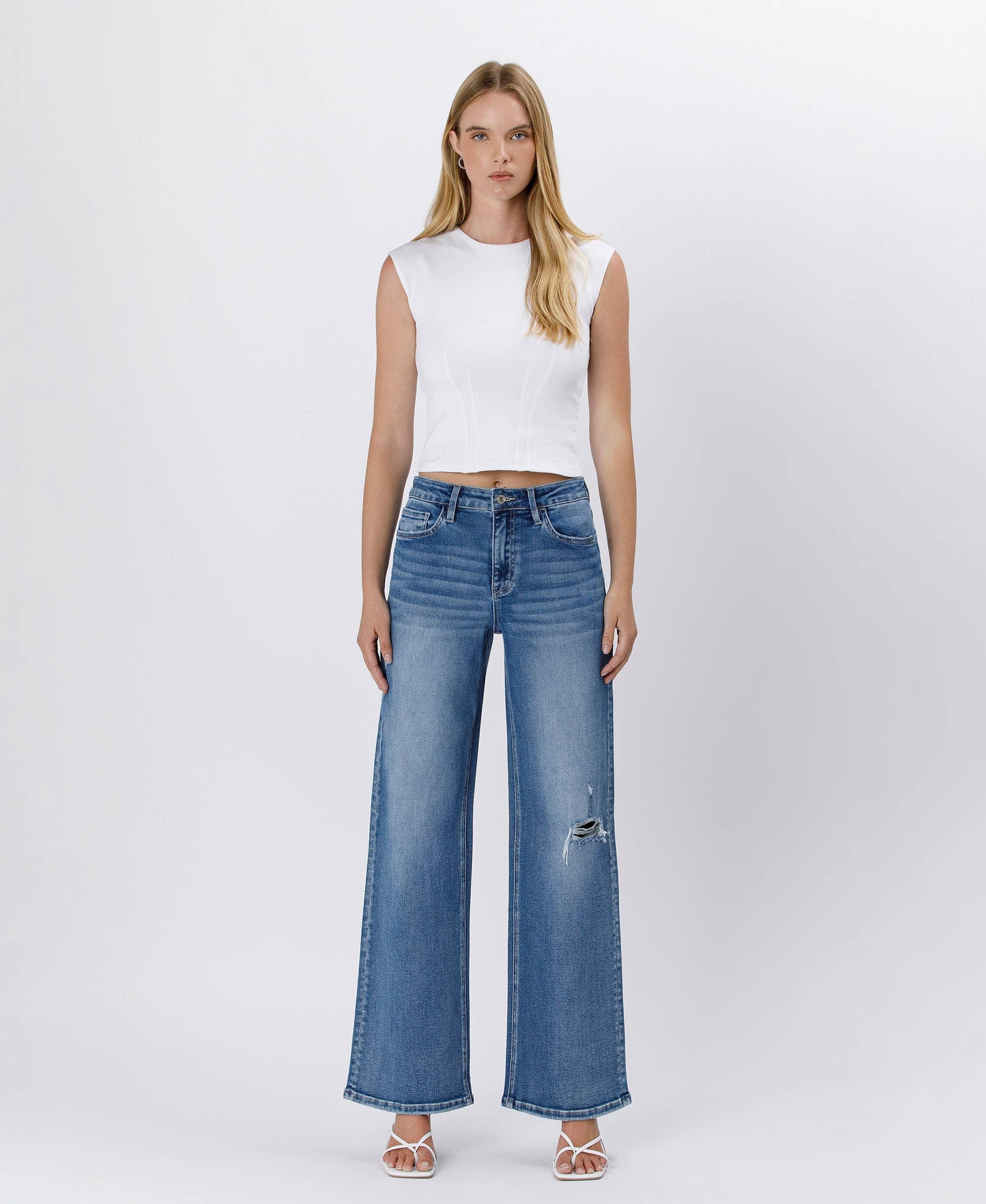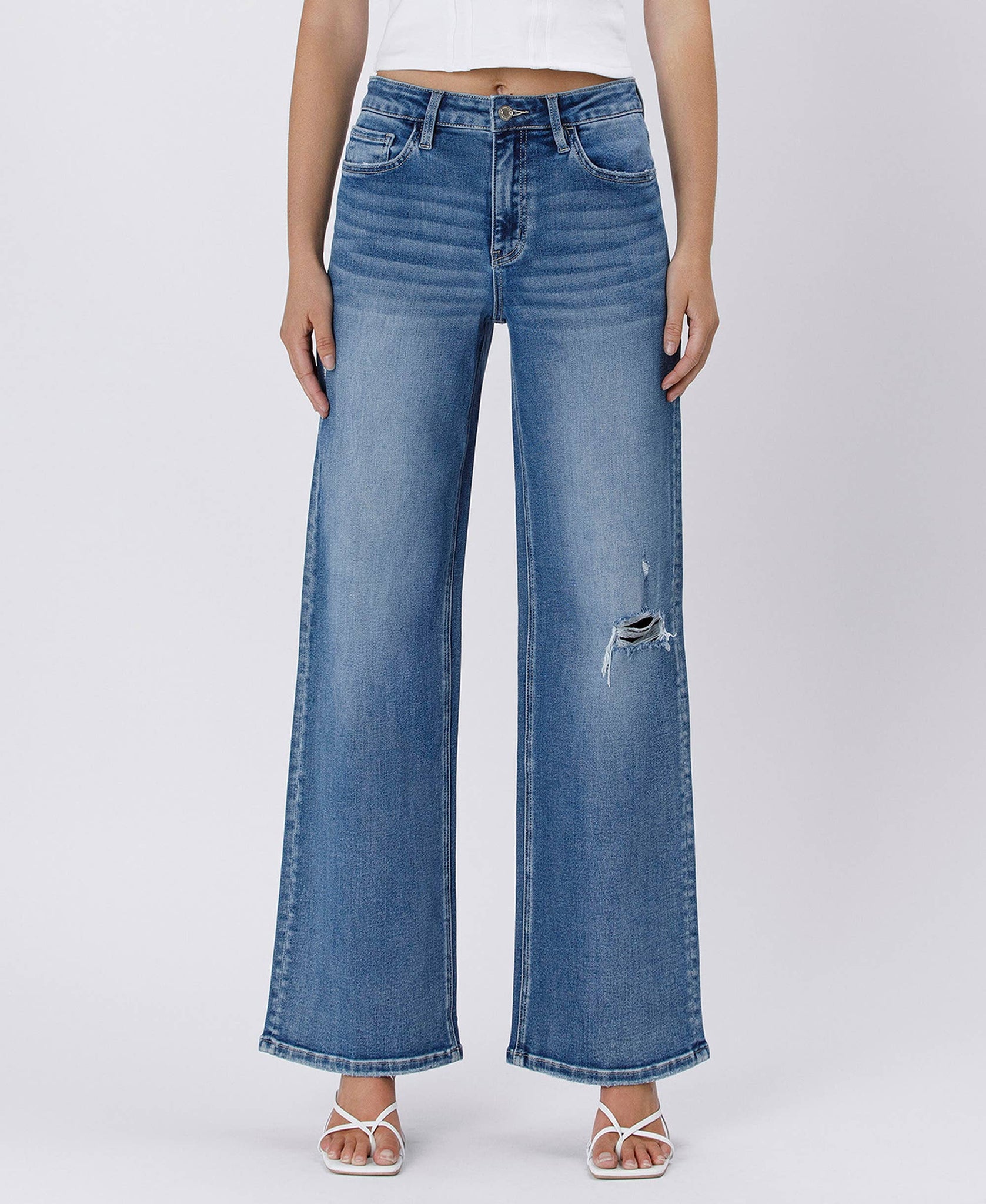 COMFORT STRETCH DENIM, SUPER HIGH RISE WAIST, DISTRESSED DETAIL, FINISHED HEM, FULL LENGTH, BAGGY WIDE JEANS